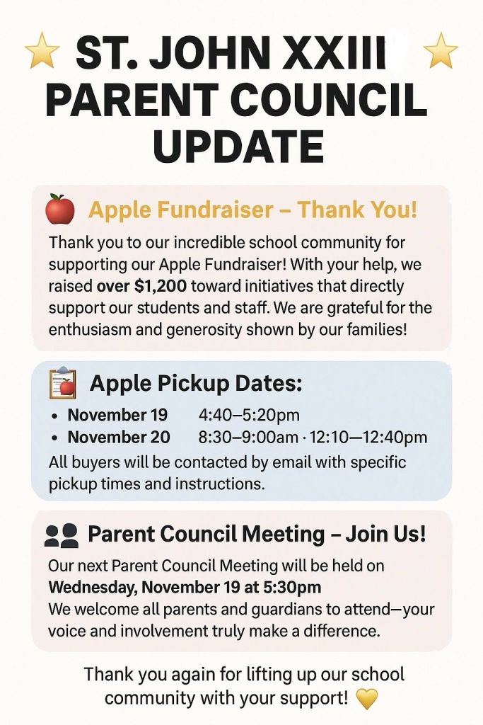 Our next School Council Meeting will be held on Wednesday, November 19 at 5:30 pm. We welcome all parents and guardians to attend—your voice and involvement truly make a difference.