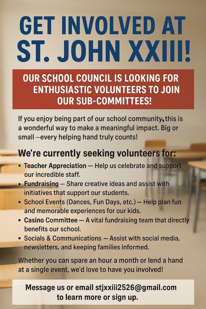Our next School Council Meeting will be held on Tuesday, February 10 at 6:00 pm. We welcome all parents and guardians to attend—your voice and involvement truly make a difference.